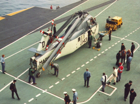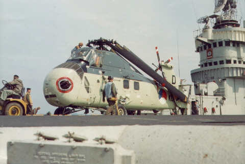 (foto 0675) Heli 143 wordt vanuit de hangar op de lift geduwd om naar het vliegdek gebracht te worden. De liftpaai kijkt gehurkt de liftput in of hij al omhoog kan. Een kleine tractor staat al gereed met trekstang om de heli naar zijn “spot” te rijden. Van de heli was het staartstuk ingevouwen en lagen de rotorbladen langs de zijkant, op deze wijze paste de heli precies op de lift.