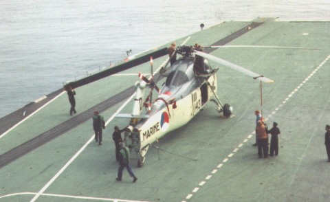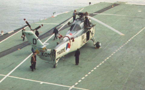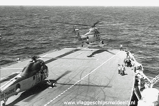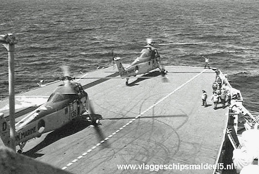 (foto 0687) Hier staan twee helicopters op het voordek gereed om het vliegkampschip te gaan verlaten. De 138 maakte later een ditch in zee. Zie ook de fotoserie van deze ditch. Foto webmaster