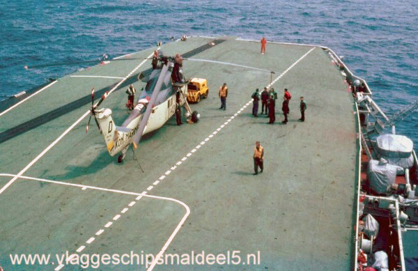 (foto 0676) De lift heeft de heli naar het vliegdek gebracht. De trekstang wordt aan de heli vastgemaakt. De borgkettingen en de wielblokken worden weg gehaald. Hiermee stond de helicopter geborgd op de lift.
