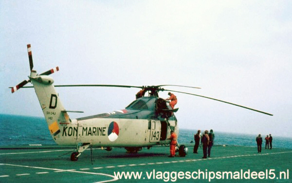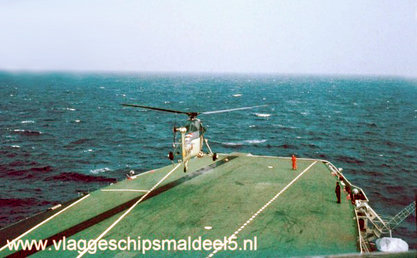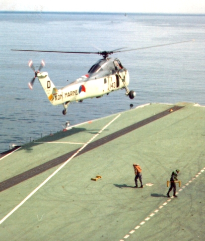 (foto 0688) Heli 143 verlaat als eerste het vliegdek van Hr.Ms. Karel Doorman. Foto webmaster.
