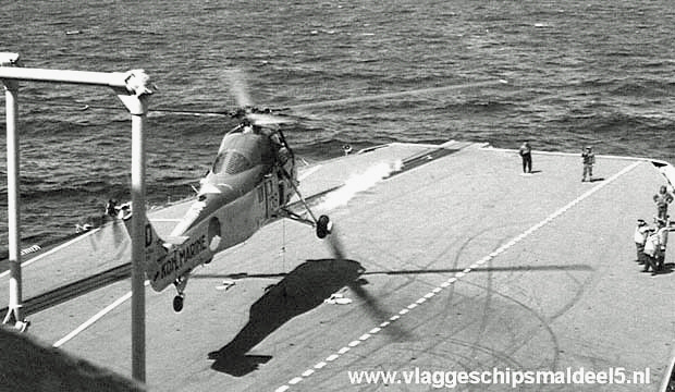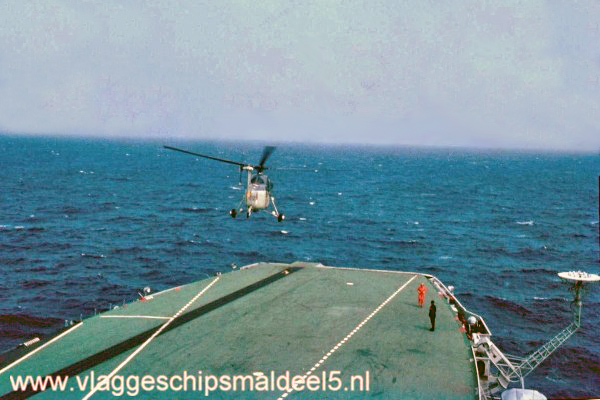 (foto 0689) Heli 138 maakt nog even een test voor het vliegkampschip wordt verlaten. Vanuit de heli liet men kabel en haak van de reddingslier of hoist een stuk zakken en weer ophalen als test. Dit was de vaste procedure als een helicopter als “plane-guard” was aangewezen. Foto webmaster.